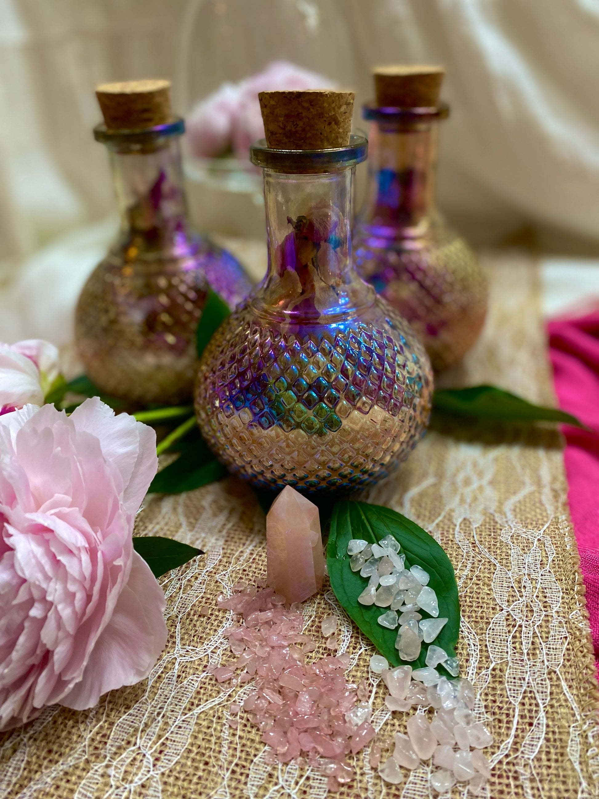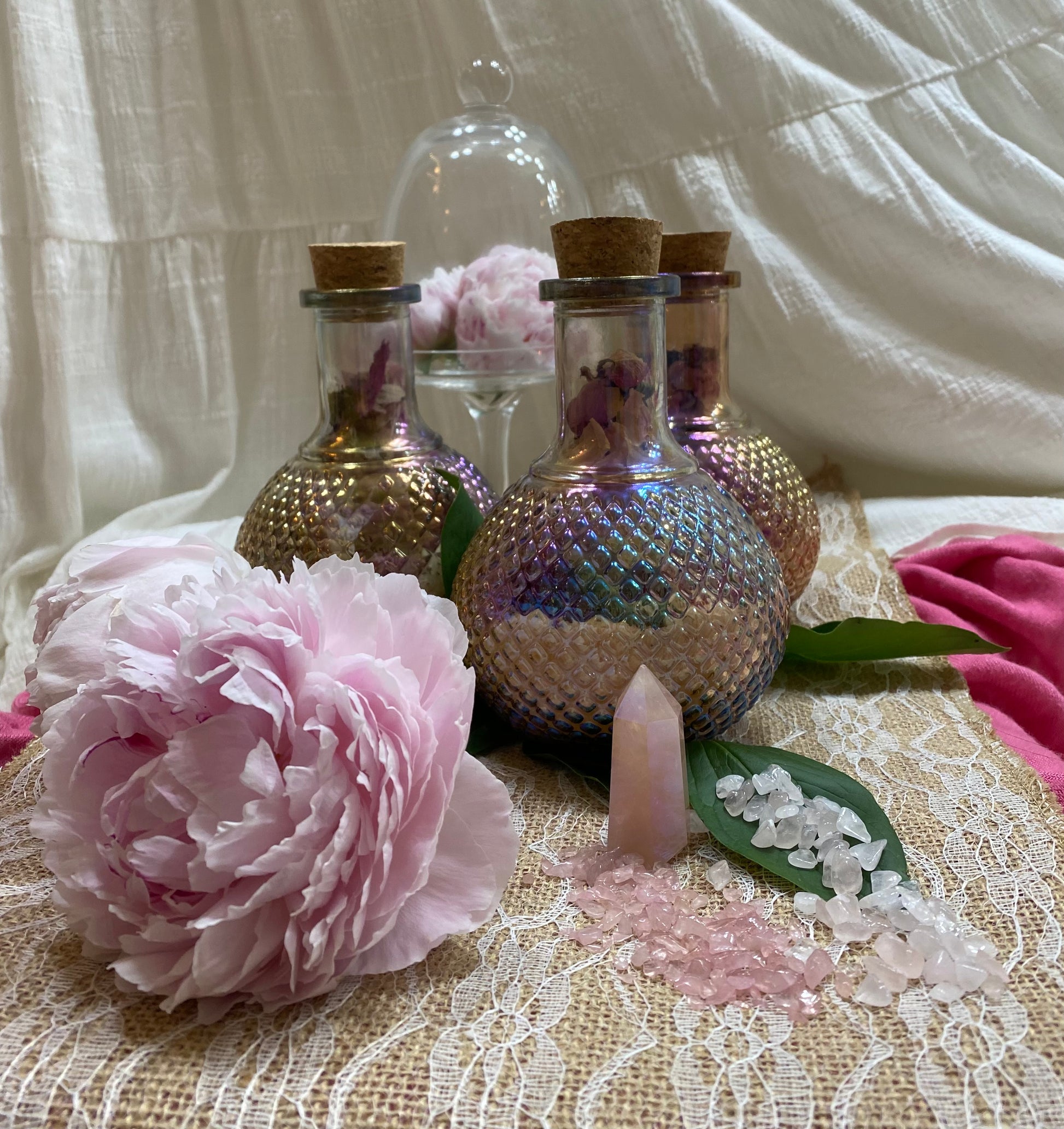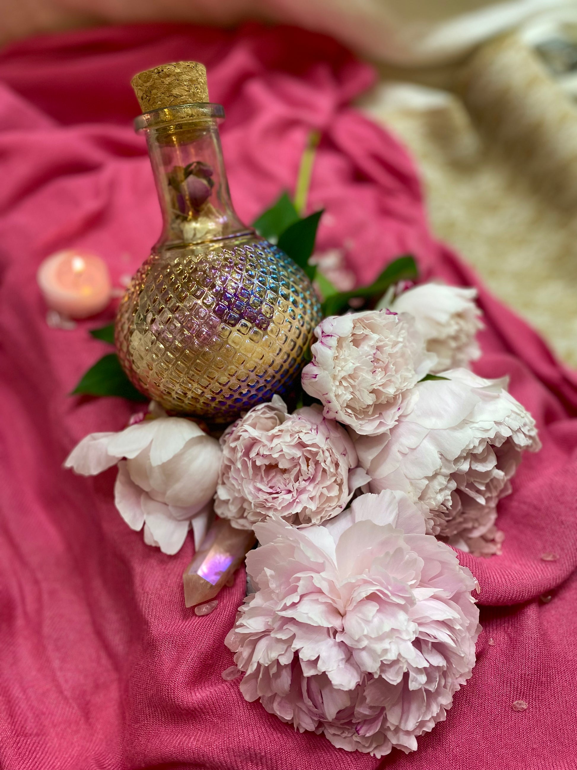 - Ingredients: This luxurious blend features dried peony petals, leaves, and Holy Basil. The delicate fusion of bergamot, basil, and mint oils, combined with pink salt and sweet orange essential oils, is soaked under the New Moon to capture their full essence. Each soak is enhanced with a tumbled Rose Quartz crystal, adding an extra layer of loving energy.